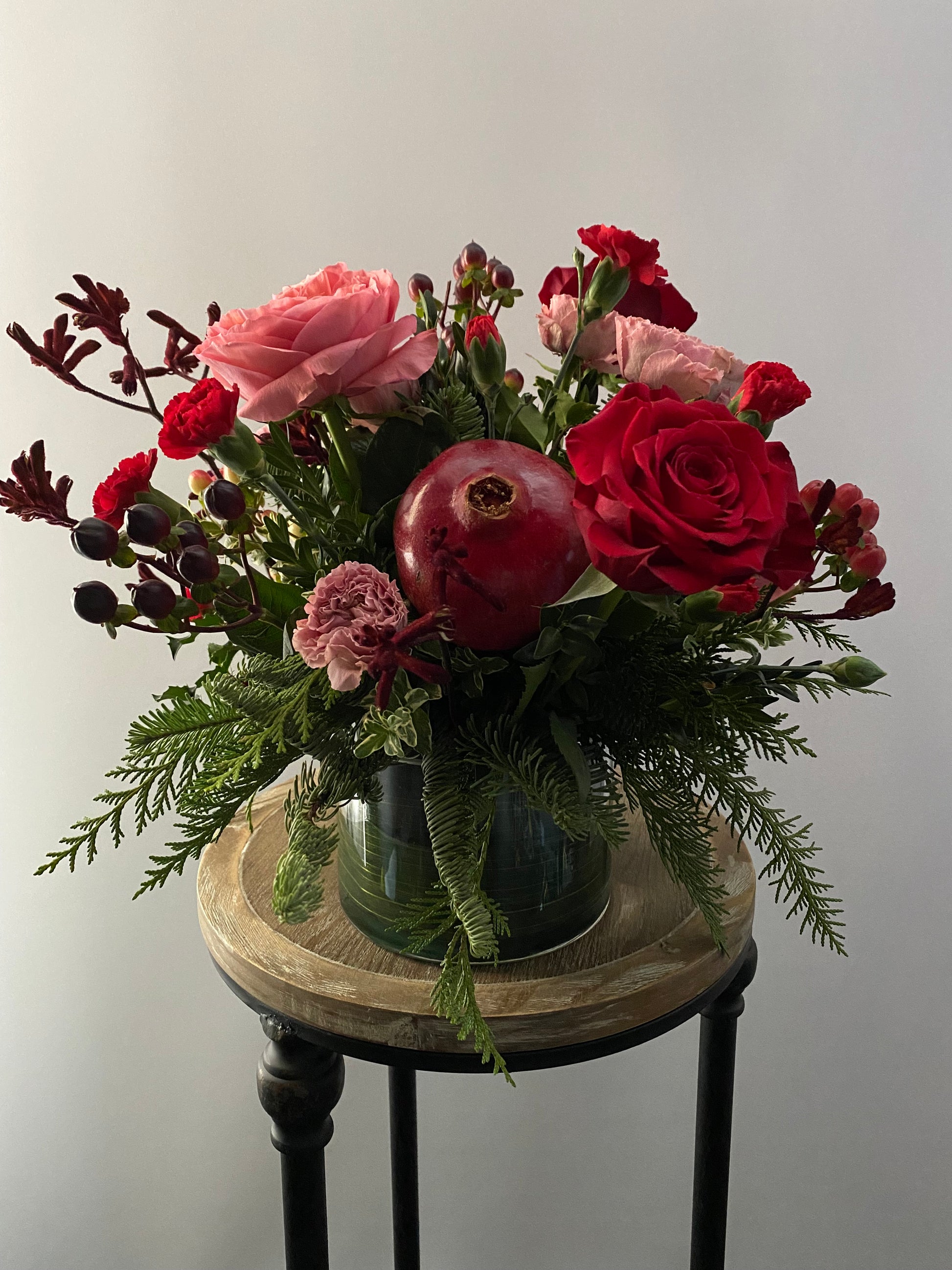 This stunning arrangement features a vibrant mix of red and pink roses, festive pink spray roses, and bold red mini carnations, creating a striking focal point. Accentuated with deep red and burgundy hypericum berries, the bouquet also includes the unique texture of kangaroo paw and lush greenery from cedar, noble fir, and boxwood. To add an elegant, seasonal touch, a whole pomegranate fruit rests gracefully in the design, nestled among the blooms and foliage, all beautifully displayed in a clear glass cylinder vase.